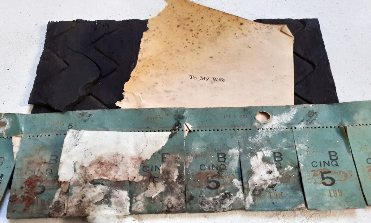 ''Cardboard, pieces of newspaper, wool, rope, oil, photos, drawings,