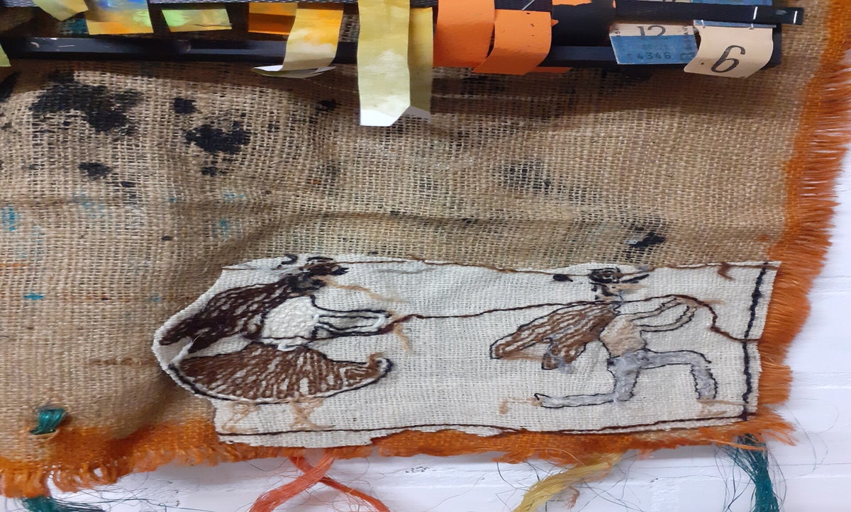 ''Karton, stukjes krant, wol, touw, olieverf, foto's, tekeningen,